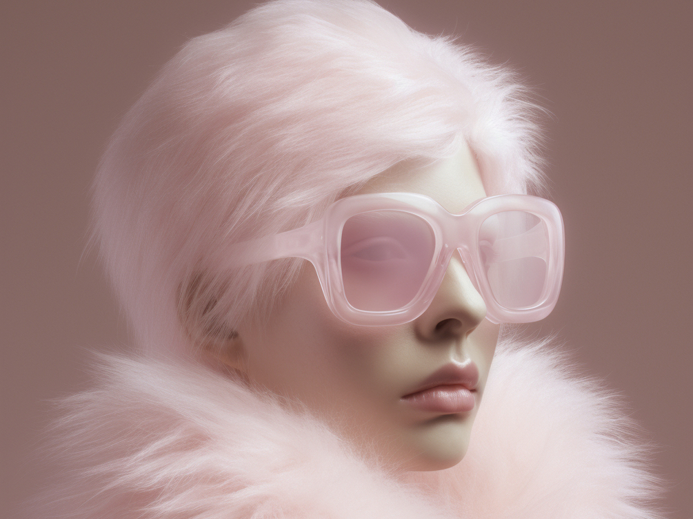 /imagine prompt: Captured during a fashion shoot, the collaboration of Jacquemus and Moncler presents a striking pair of sunglasses, crafted in light pink translucent fur. The image, executed in hyper-realistic detail, is displayed in an 8k resolution for an extraordinarily realistic effect. The composition follows a 2:3 aspect ratio and has been rendered at a scale of 750.